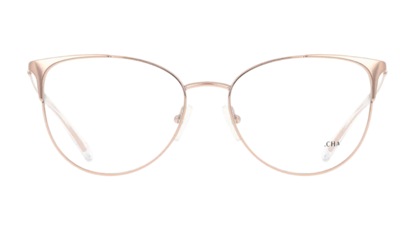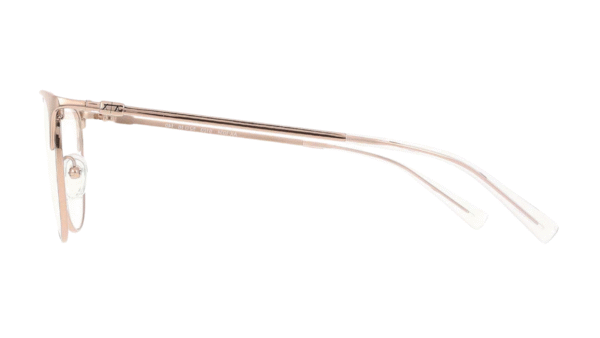 Montura: Elegible para lentes progresivos, formulados, montura completa, en metal, con forma cat-eye femenina, color rose gold