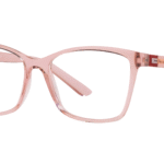 Montura: Elegible para lentes progresivos, formulados, acetato ligero, forma rectangular suavizada y color rosa translúcido