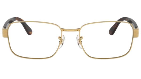 Montura: Elegible para lentes progresivos, formulados, estructura metal/acetato, acabado oro Arista brillante, diseño rectangular elegante
