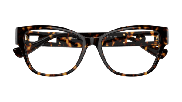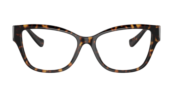 Montura: Elegible para lentes progresivos, formulados, material Acetato en acabado Havana (carey clásico), forma estilo “pillow” rectangular con aro completo