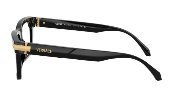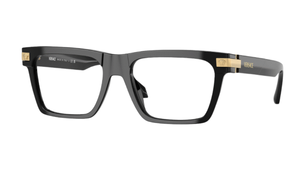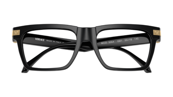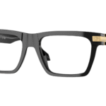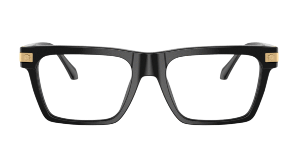 Montura: Elegible para lentes progresivos, formulados, material Acetato negro brillante (Black—GB1), diseño rectangular tipo “pillow”, con marco completo