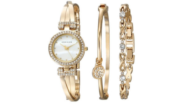 Integra mecanismo de cuarzo con batería, cristales Swarovski incrustados en bisel y brazalete, esfera mineral resistente a impactos, resistencia a salpicaduras y se entrega como un set con pulseras a juego