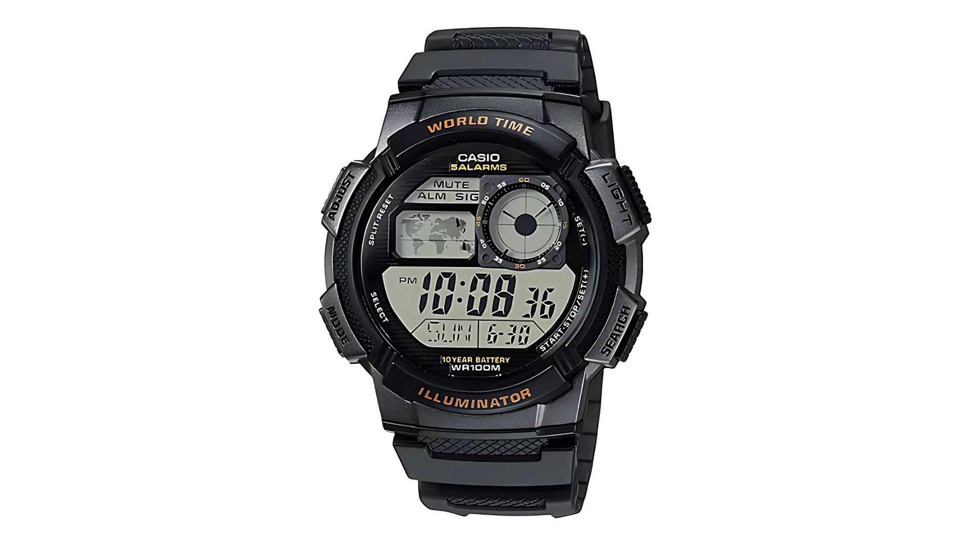 Integra cronómetro de 1/100 seg, hora mundial, temporizador, cinco alarmas, calendario automático, luz LED y resistencia al agua de 100m, con batería de 10 años y precisión confiable para el uso diario