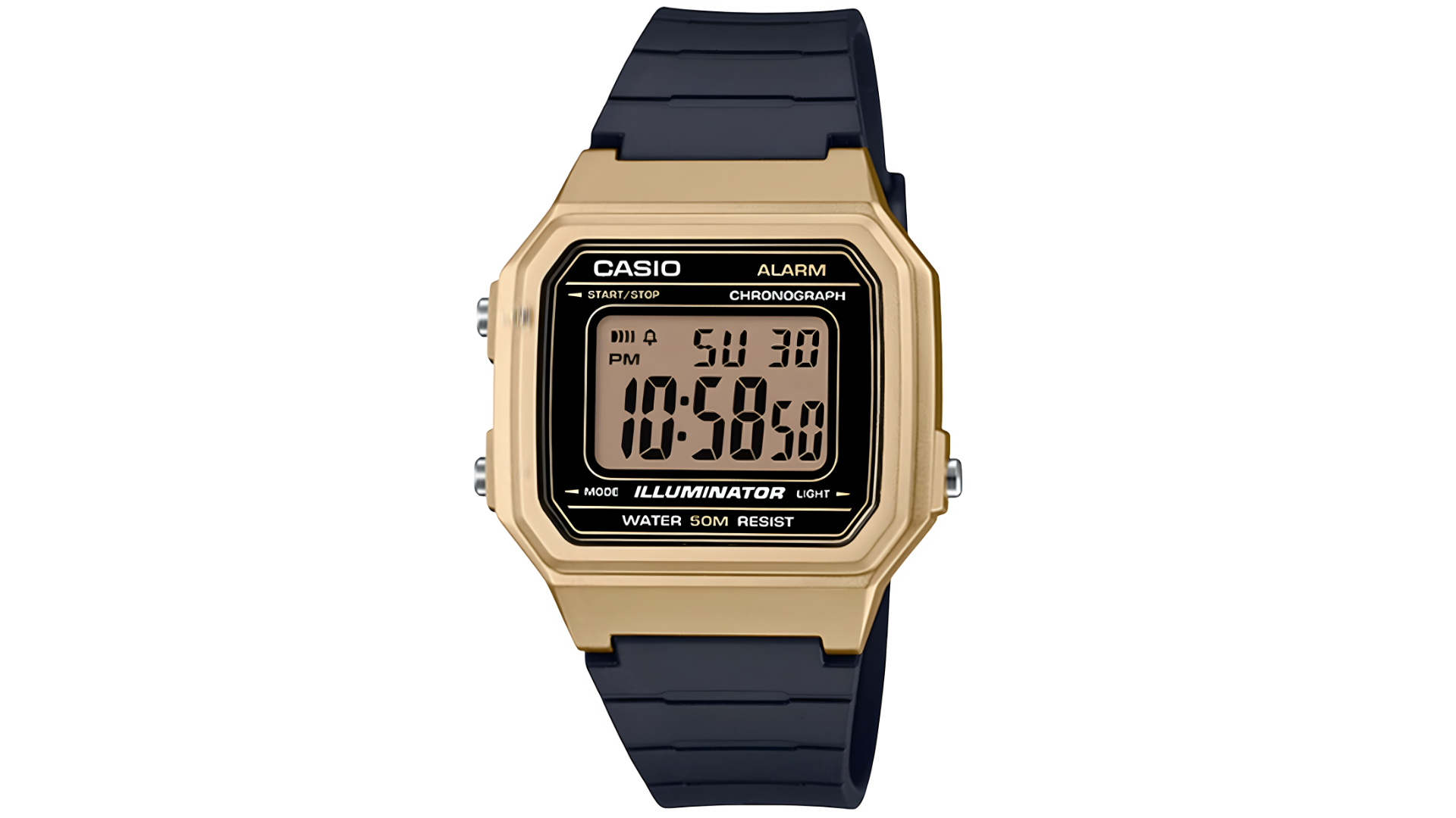 Integra luz LED frontal, cronómetro de 1/100 s, temporizador, 5 alarmas, doble zona horaria, calendario automático, formato 12/24 h, precisión ±30 s/mes, batería de 10 años y resistencia al agua de 100 m