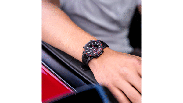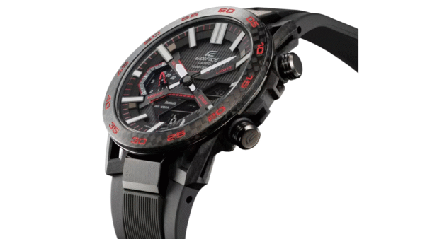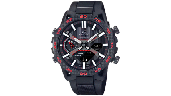 Integra carcasa de resina con fibra de carbono y acero, carga solar “Tough Solar”, conectividad Bluetooth para sincronización con smartphone y gestión de cronómetro/horas mundiales, resistencia al agua de 100 m
