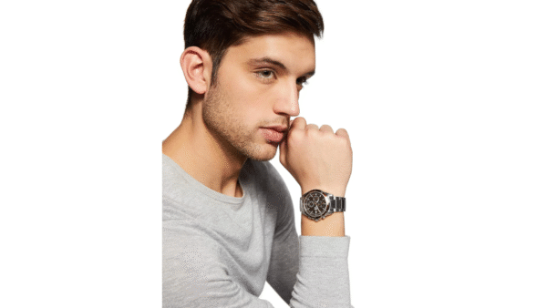 Integra cronógrafo analógico de diseño deportivo con caja de acero inoxidable, correa de acero inoxidable, cristal mineral, resistencia al agua de 100 metros y precisión de ±20 segundos al mes