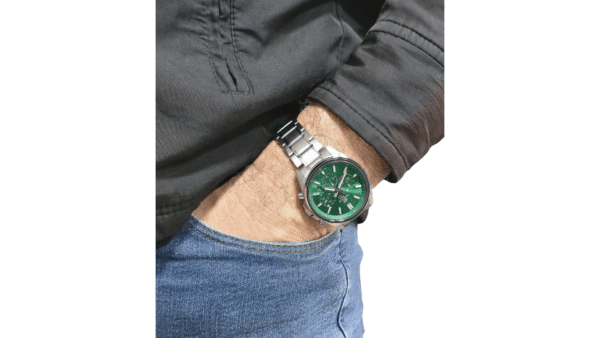 Integra cronógrafo analógico de precisión con parada de 1 seg (hasta 59’59″), visualización de fecha, caja y correa de acero inoxidable, cristal mineral, batería estimada de 2 años y resistencia al agua hasta 100 m
