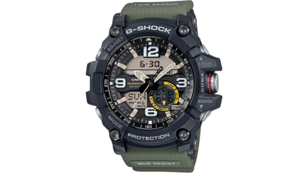 Integra sensor dual (brújula digital y termómetro –10 °C a 60 °C), estructura resistente al barro e impactos, cronómetro 1/100 s, temporizador, 5 alarmas, hora mundial en 31 zonas, luz LED automática, calendario hasta 2099 y estanqueidad 200 m