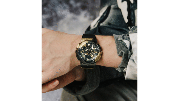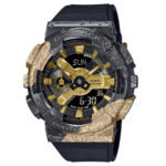Integra bisel metálico forjado y bañado en iones combina colores dorado y negro, representando la calcita. La correa de resina negra presenta una textura irregular obtenida mediante estampado en caliente