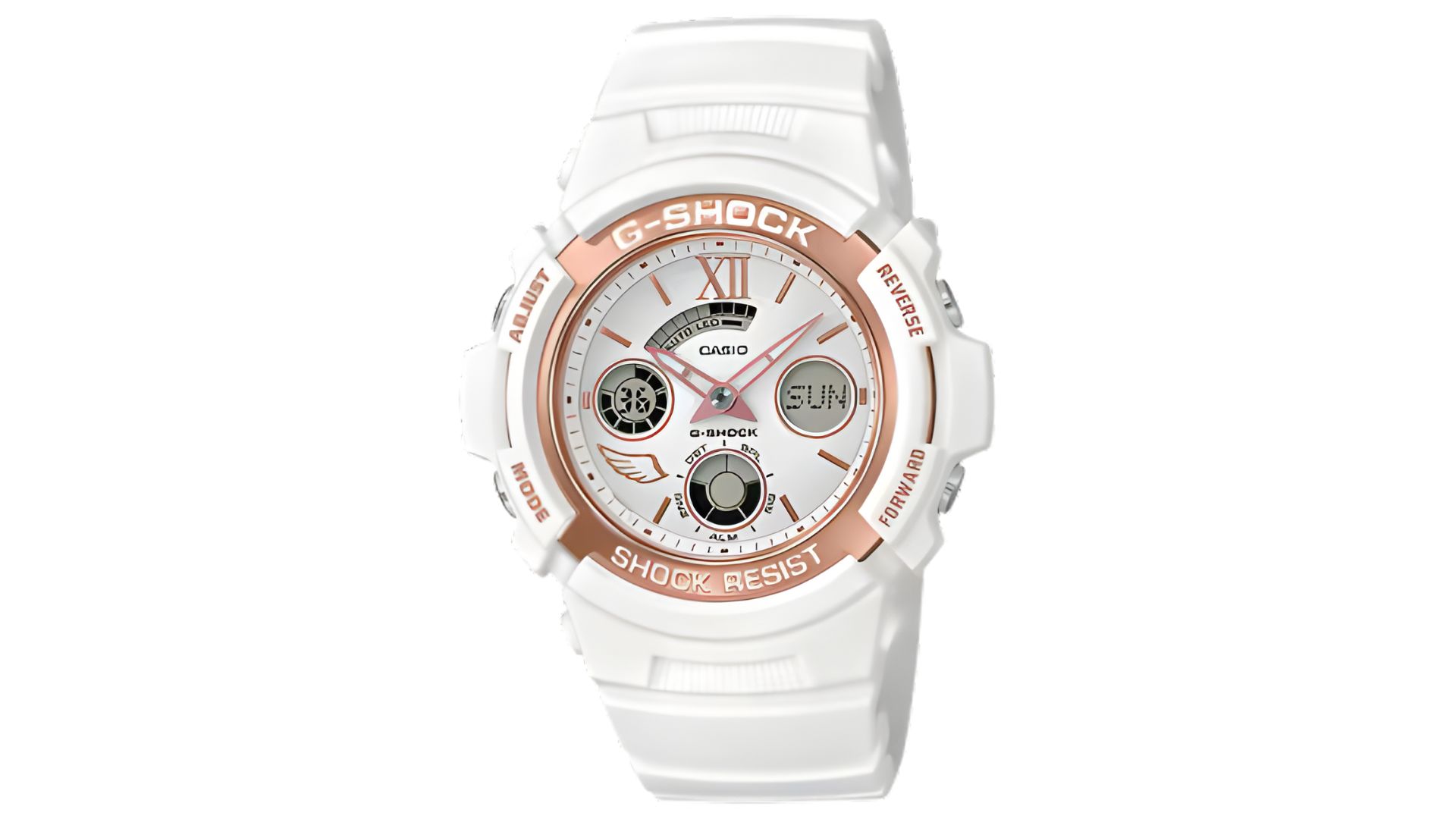 Edición especial pareja con estructura resistente a impactos, cristal mineral, hermeticidad (100 m según algunas fuentes) y funciones analógico-digital como cronómetro, temporizador, zona horaria mundial, 5 alarmas y luz LED.