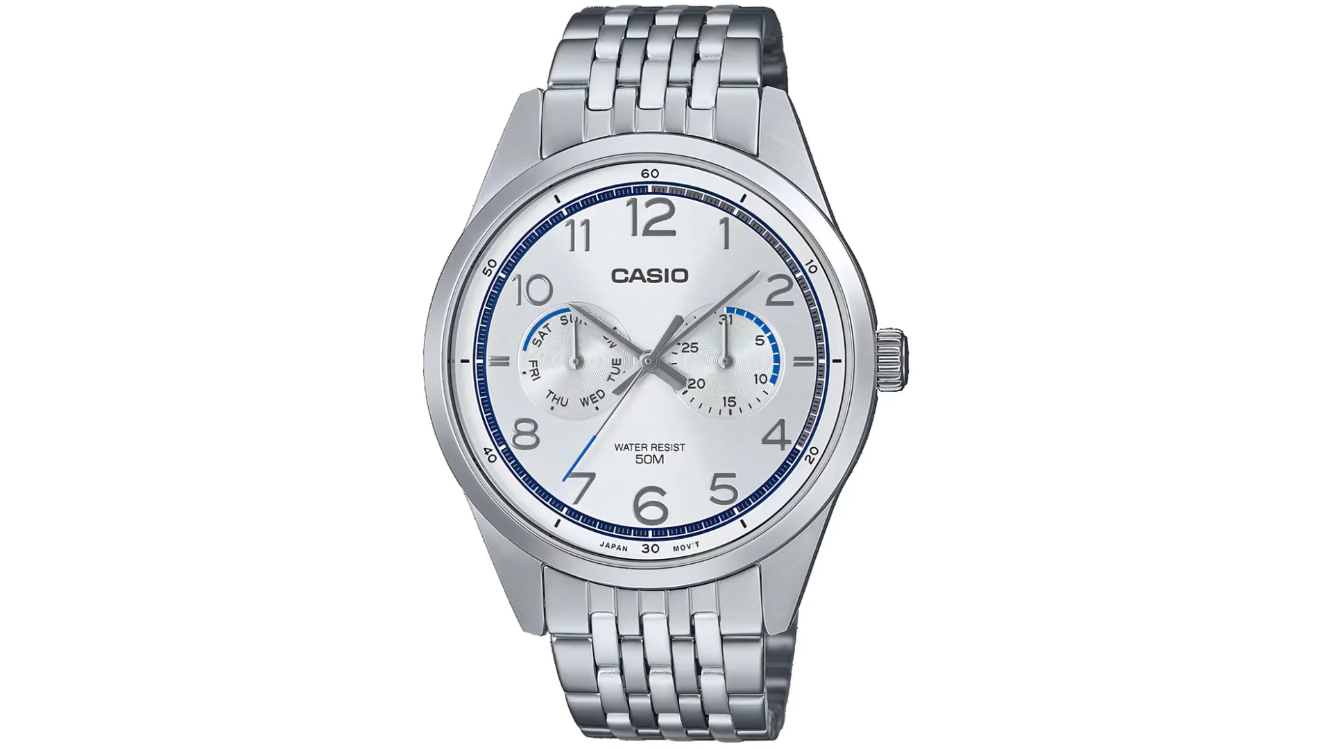 Integra caja de acero de 42×38,5×10,4 mm, bisel giratorio unidireccional, visualización de fecha, resistencia al agua hasta 50 m, pulsera de acero, batería con duración aproximada de 3 años y precisión de ±20 s/mes