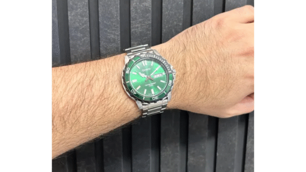 Integra visualización analógica de horas, minutos y segundos, calendario con día y fecha, bisel unidireccional anti-reversa, cristal mineral, resistencia al agua de 100 m, y precisión de ±20 s/mes con batería aproximada de 3 años