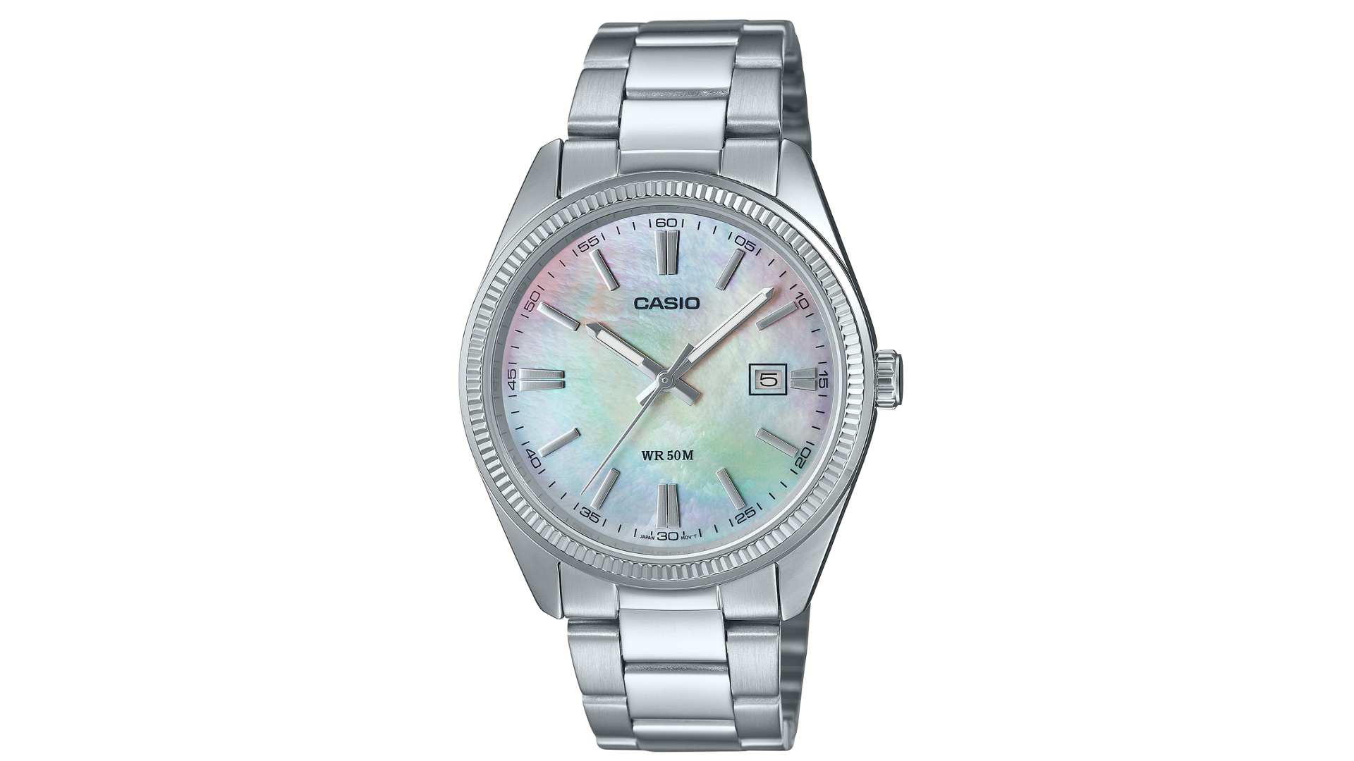 Reloj con caja de acero ion-plateado y correa de acero tipo triple-fold, carátula de nácar, movimiento cuarzo con manecillas de horas, minutos y segundos, ventana de fecha a las 3, cristal mineral, resistencia al agua de 50m, precisión ±20 s/mes, batería