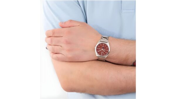 Integra indicación de fase lunar, diales auxiliares día/fecha, movimiento de cuarzo con precisión ±20 s/mes, vidrio mineral resistente, correa de acero, batería con duración estimada de 3 años y resistencia al agua 50 m.