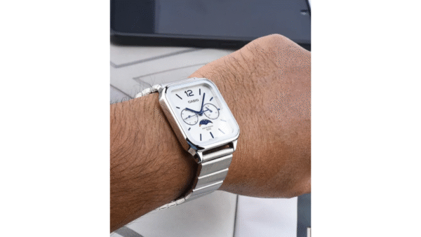 Integra función de fase lunar junto a diales de día y fecha, movimiento de cuarzo con batería de aproximadamente 3 años, caja de acero inoxidable de 44,5 × 34 × 9,3 mm, cristal mineral y resistencia al agua de 50 m