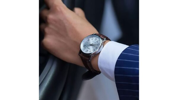 Integra reloj analógico con movimiento de cuarzo, visualización de fecha, tres agujas (hora, minuto, segundo), precisión ±20 s/mes, batería con autonomía de 3 años, cristal mineral, correa de cuero genuino y resistencia al agua para uso diario.