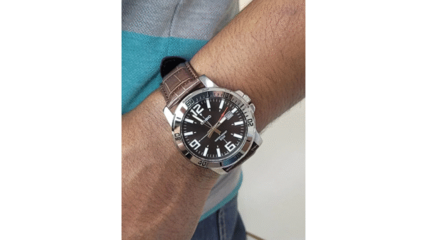 Integra movimiento de cuarzo, visualización de fecha, cristal mineral, correa de piel genuina, caja de acero de 49 × 45 × 10,3 mm, resistencia al agua hasta 50 m, batería de aproximadamente 3 años, y precisión de ±20 s/mes