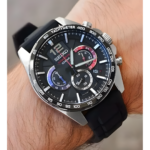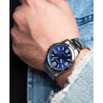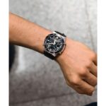 Integra caja plateada con tablero negro de 49 × 45 × 10,3 mm; correa de cuero negra; movimiento de cuarzo analógico de tres manecillas con fechador; cristal mineral; precisión ± 20 s/mes; resistencia al agua 50 m (5 ATM).