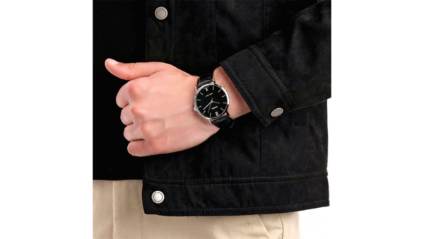 Integra caja de 46 × 40 × 8,2 mm; correa de cuero negra de 20 mm; carátula negra; movimiento de cuarzo analógico de 3 manecillas; cristal mineral; resistencia al agua 30 m (3 ATM); diseño minimalista elegante, color Negro
