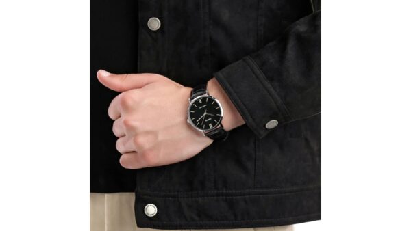 Integra caja plateada con tablero negro de 46 × 40 × 8,2 mm; correa de cuero negra; movimiento de cuarzo de 3 manecillas; precisión ±20 s/mes; cristal mineral; resistencia al agua tipo “water resistant” (3 ATM).