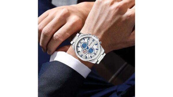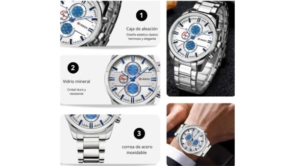 Integra movimiento de cuarzo japonés preciso, incluye cronógrafo funcional, calendario de fecha, manecillas luminosas para visibilidad en la oscuridad y caja con resistencia al agua de 3 ATM (~30 m) apta para uso diario