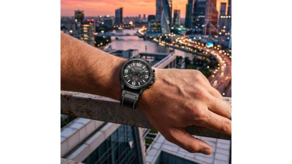 Integra cronógrafo de cuarzo con subesferas funcionales para medición de tiempo, indicador de fecha y formato 24 horas; caja de aleación con cristal mineral resistente y correa de cuero, con resistencia al agua 3ATM para salpicaduras y uso diario