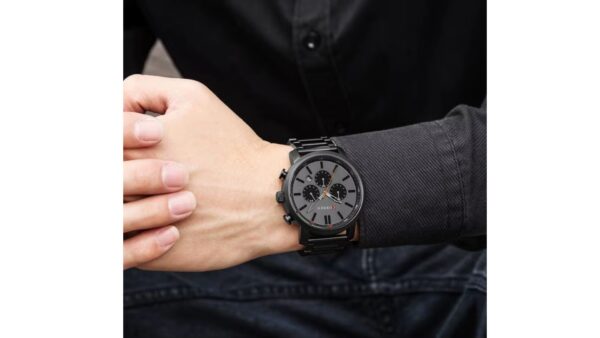 Integra caja negro mate con bisel negro de 46 mm × 13 mm; correa metálica pavonada de 22 mm; movimiento de cuarzo; resistencia al agua 3 ATM; cronógrafo; calendario; diseño analógico elegante y robusto.