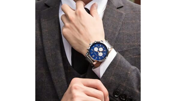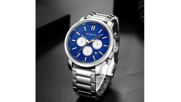 Integra caja plateada con bisel azul de 46 mm × 13 mm; correa metálica plateada de acero inoxidable de 22 mm; movimiento de cuarzo; resistencia al agua 3 ATM; calendario; diseño analógico sobrio y contemporáneo.