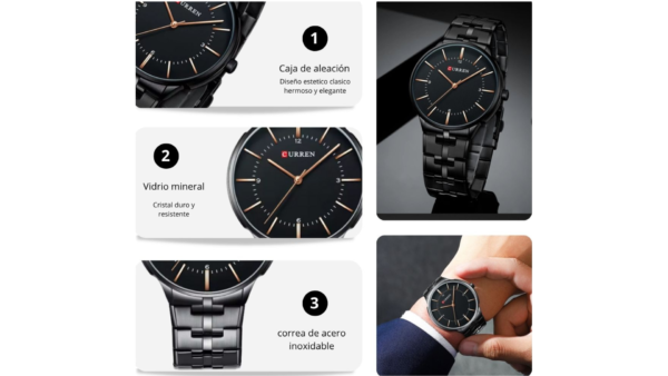 Integra movimiento de cuarzo, dimensiones 42mm x 9mm, color tablero negro, color de la caja negro, material lente vidrio mineral, caja en aleación, color del pulso negro, pulso de acero inoxidable, analógica: manecillas (hora, segundos y minutos)