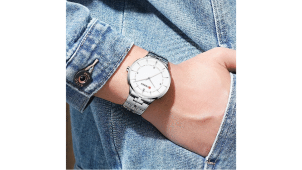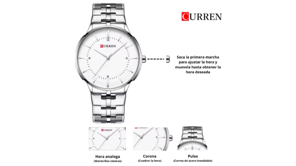 Integra movimiento de cuarzo, dimensiones 42mm x 9mm, color tablero blanco, color de la caja plateado, material lente vidrio mineral, caja en aleación, color del pulso plateado, pulso de acero inoxidable, analógica manecillas (hora, segundos y minutos)