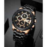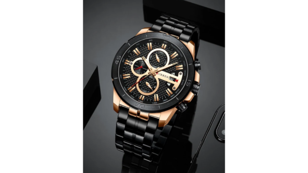 Integra cronógrafo análogo con subesferas funcionales, calendario integrado y manecillas luminosas, equipado con movimiento de cuarzo preciso; construcción en acero inoxidable, diseño robusto de gran presencia y resistencia básica a salpicaduras