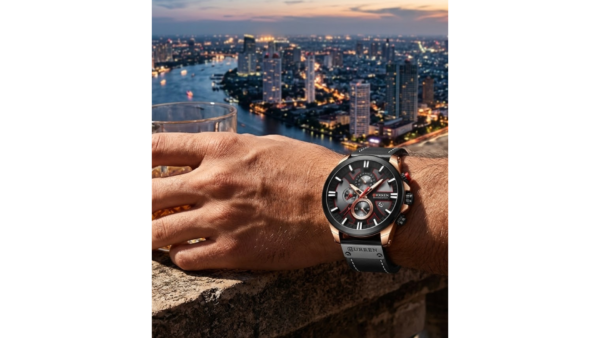 Integra cronógrafo de cuarzo con subesferas funcionales para medición de tiempo, indicador de fecha y manecillas luminosas; caja de aleación con cristal mineral resistente y correa de cuero, con resistencia al agua 3ATM para salpicaduras y uso diario