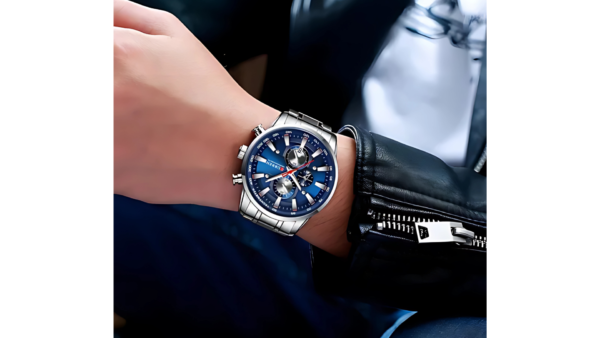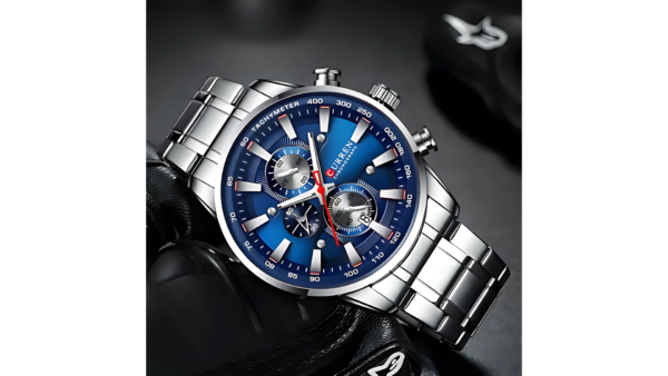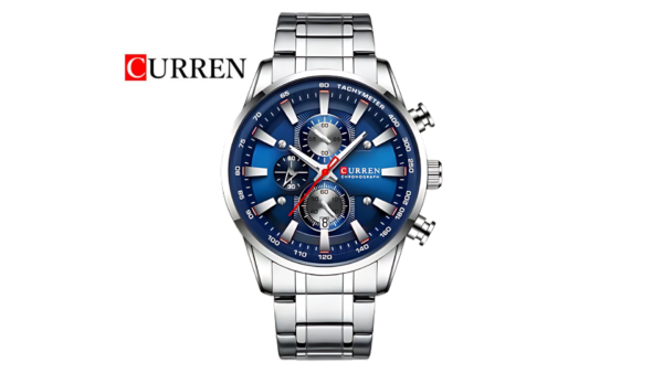 Integra caja plateada con bisel azul de 45 mm × 13 mm; correa plateada de acero inoxidable de 24 mm; movimiento de cuarzo; resistencia al agua 3 ATM; cronógrafo; calendario; diseño analógico elegante