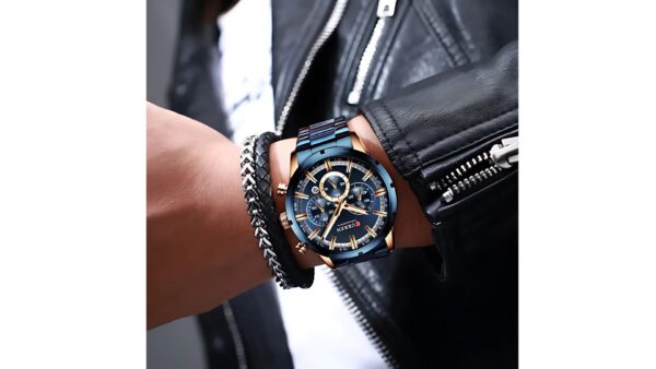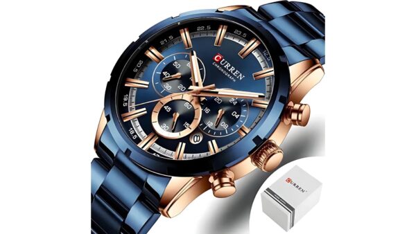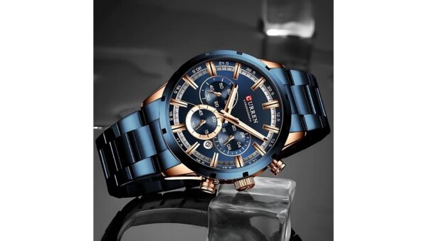 Integra caja azul/oro rosa con bisel azul de 47 mm × 13 mm; correa azul de acero inoxidable de 24 mm; movimiento de cuarzo japonés; resistencia al agua 3 ATM; cronógrafo; calendario; diseño analógico elegante.