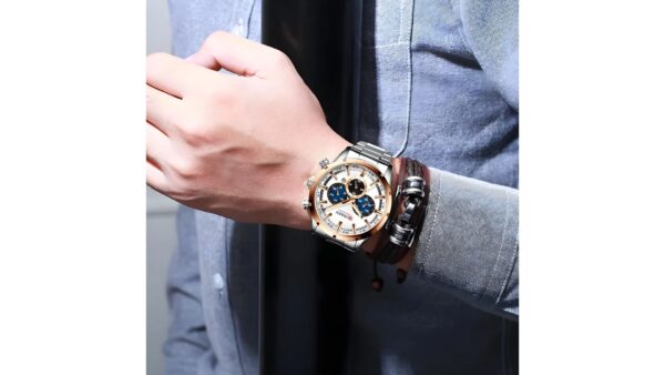 Integra caja plateada con bisel blanco/Oro Rosa de 47 mm × 13 mm; correa plateada de acero inoxidable de 24 mm; movimiento de cuarzo; resistencia al agua 3 ATM; cronógrafo; calendario; diseño analógico elegante.