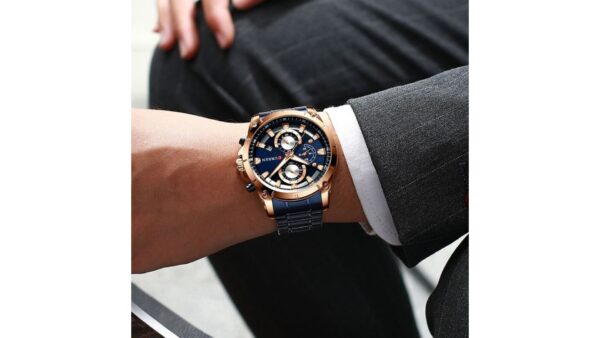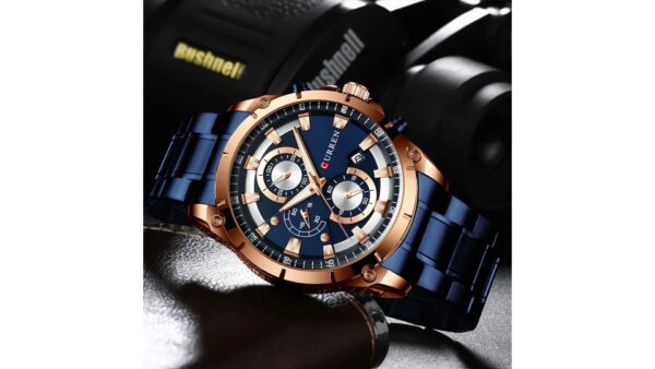 Integra caja oro rosa/azul de 47 mm × 14 mm; correa azul de acero inoxidable de 24 mm; movimiento de cuarzo japonés; resistencia al agua 3 ATM; cronógrafo; calendario; diseño analógico elegante