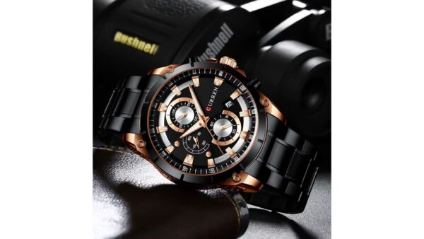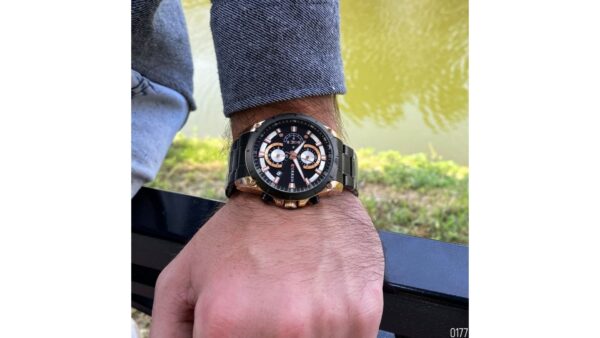 Integra caja pavonada / oro rosa con bisel negro de 47 mm × 14 mm; correa de acero inoxidable Pavonada de 24 mm; movimiento de cuarzo japonés; resistencia al agua 3 ATM; cronógrafo; calendario; diseño analógico elegante.