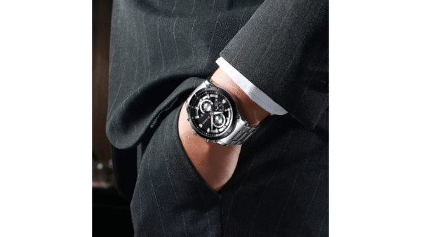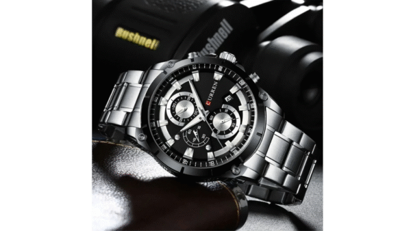 Integra caja plateada con bisel negro de 47 mm × 14 mm; correa plateada de acero inoxidable de 24 mm; movimiento de cuarzo; resistencia al agua 3 ATM; cronógrafo; calendario; diseño analógico elegante.