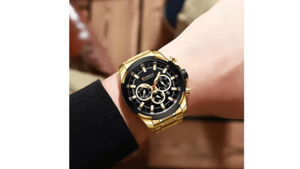 reloj analógico de cuarzo con subesferas estilo cronógrafo, indicador de 24 horas y calendario integrado; caja metálica robusta con cristal resistente a rayones y pulso en acero inoxidable que brinda durabilidad y estilo deportivo para uso diario. ⌚