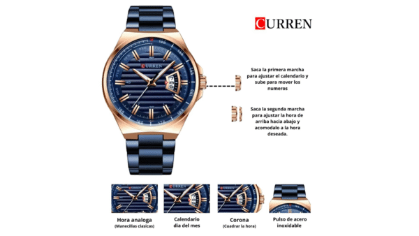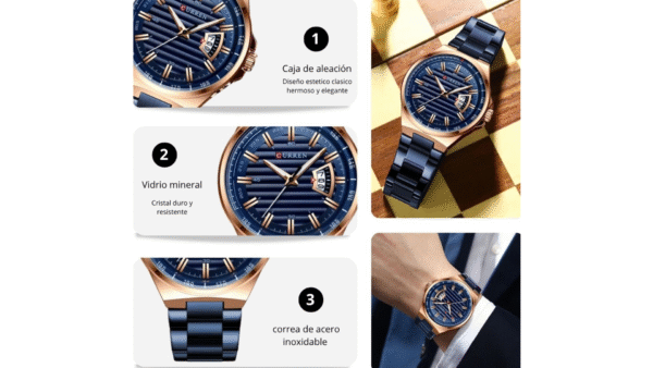 Integra movimiento de cuarzo, dimensiones 45mm x 11mm color tablero azul, color de la caja oro rosa, material lente vidrio mineral, caja en aleación, pulso azul, pulso de acero inoxidable, analógica manecillas (hora, segundos y minutos), calendario