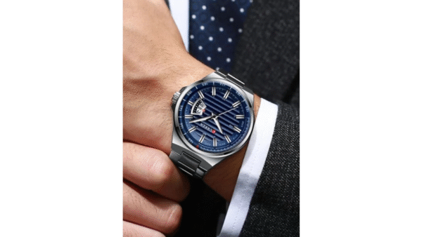 Integra movimiento de cuarzo, dimensiones 45mm x 11mm color tablero azul, color de la caja plateado, material lente vidrio mineral, caja en aleación, pulso plateado, pulso de acero inoxidable, analógica manecillas (hora, segundos y minutos), calendario