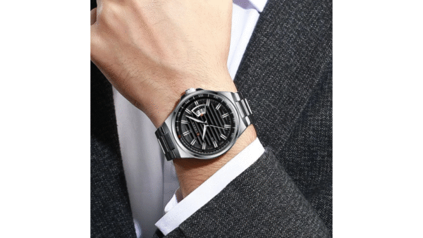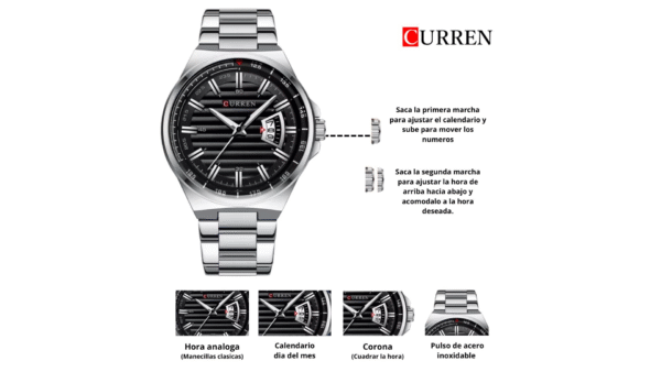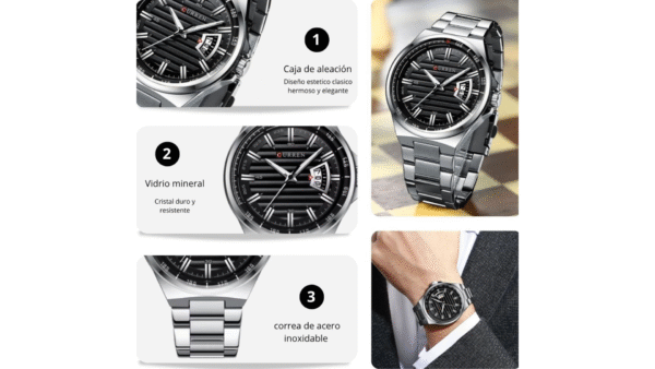 Integra movimiento de cuarzo, dimensiones 45mm x 11mm color tablero negro, color de la caja plateado, material lente vidrio mineral, caja en aleación, pulso plateado, pulso de acero inoxidable, analógica manecillas (hora, segundos y minutos), calendario