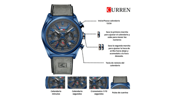 Integra diseño elegante con cronógrafo funcional, calendario integrado y movimiento de cuarzo preciso, ofreciendo resistencia al agua para uso diario y una correa duradera que asegura comodidad y estilo en cualquier ocasión