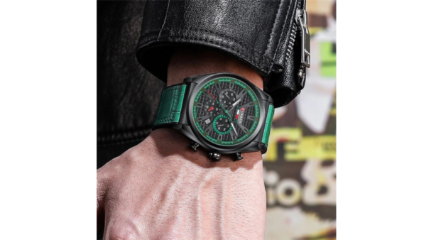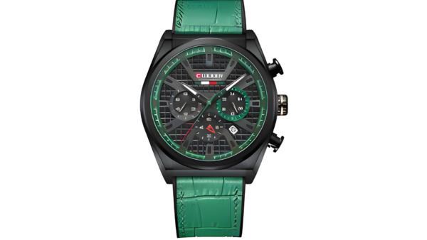 reloj analógico de cuarzo con subesferas estilo cronógrafo, indicador de 24 horas y calendario integrado; caja metálica robusta con cristal mineral resistente a rayones y correa de cuero sintético texturizado diseñada para comodidad y uso diario. ⌚