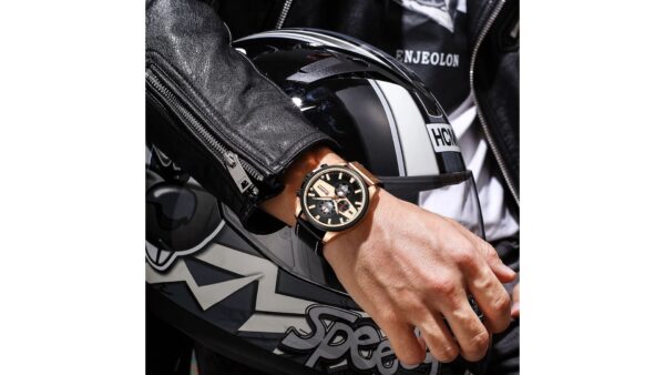 Integra movimiento de cuarzo japonés preciso; cronógrafo y calendario completo integrados; resistencia al agua 3 ATM práctica para salpicaduras; vidrio tipo Hardlex; correa de cuero genuino ajustable; caja de gran diámetro (~49 mm)