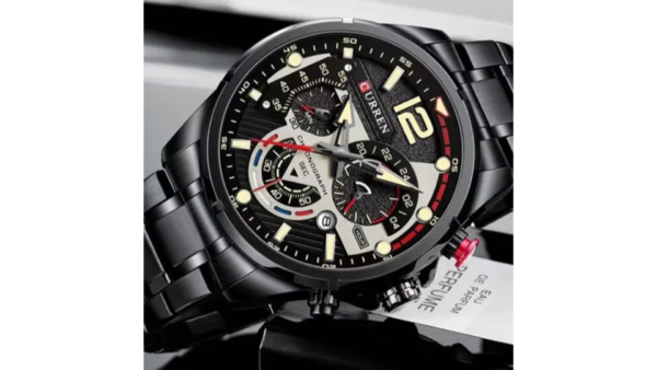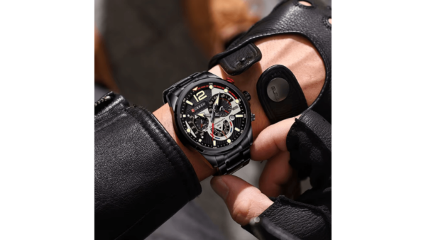 Integra cronógrafo de cuarzo con subesferas funcionales para medición precisa del tiempo, indicador de fecha y manecillas luminosas; caja y brazalete de acero inoxidable con cristal mineral resistente y resistencia al agua 3ATM para uso diario