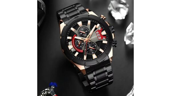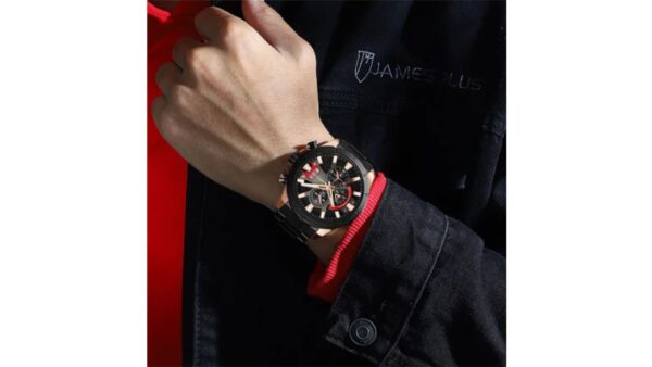 Integra caja pavonada / oro rosa de 53 mm × 14 mm; correa oro rosa de acero inoxidable de 23 mm; movimiento de cuarzo japonés; resistencia al agua 3 ATM (lavado de manos, lluvia ligera); cronógrafos funcionales; calendario; diseño analógico elegante.