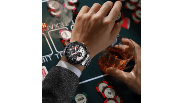 Integra cronógrafo de cuarzo con subesferas funcionales para medición de tiempo, indicador de fecha y manecillas luminosas; caja de aleación con cristal mineral resistente y correa de acero inoxidable, con resistencia al agua 3ATM para salpicaduras