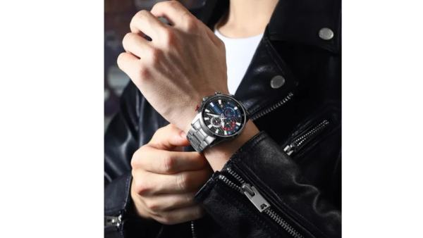 reloj analógico de cuarzo con subesferas estilo cronógrafo funcional, indicador de segundos y calendario integrado; caja metálica resistente con cristal mineral antirayones y pulso en acero inoxidable que ofrece durabilidad y precisión para uso diario. ⌚