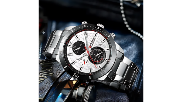 Integra caja plateada/negro con bisel blanco de 40 mm × 10 mm; correa plateada de acero inoxidable de 20 mm; movimiento de cuarzo; resistencia al agua 3 ATM; cronógrafo; calendario; diseño analógico elegante